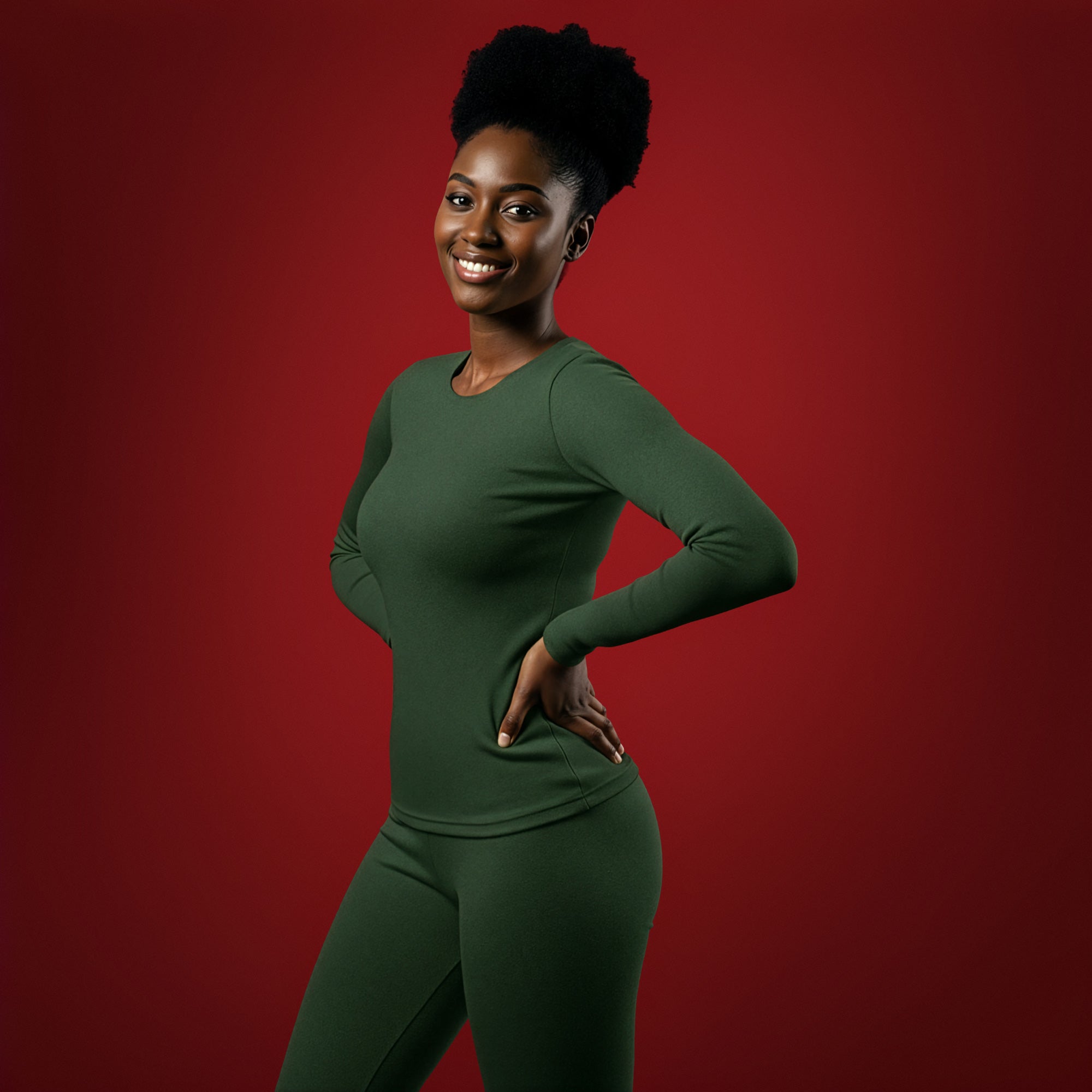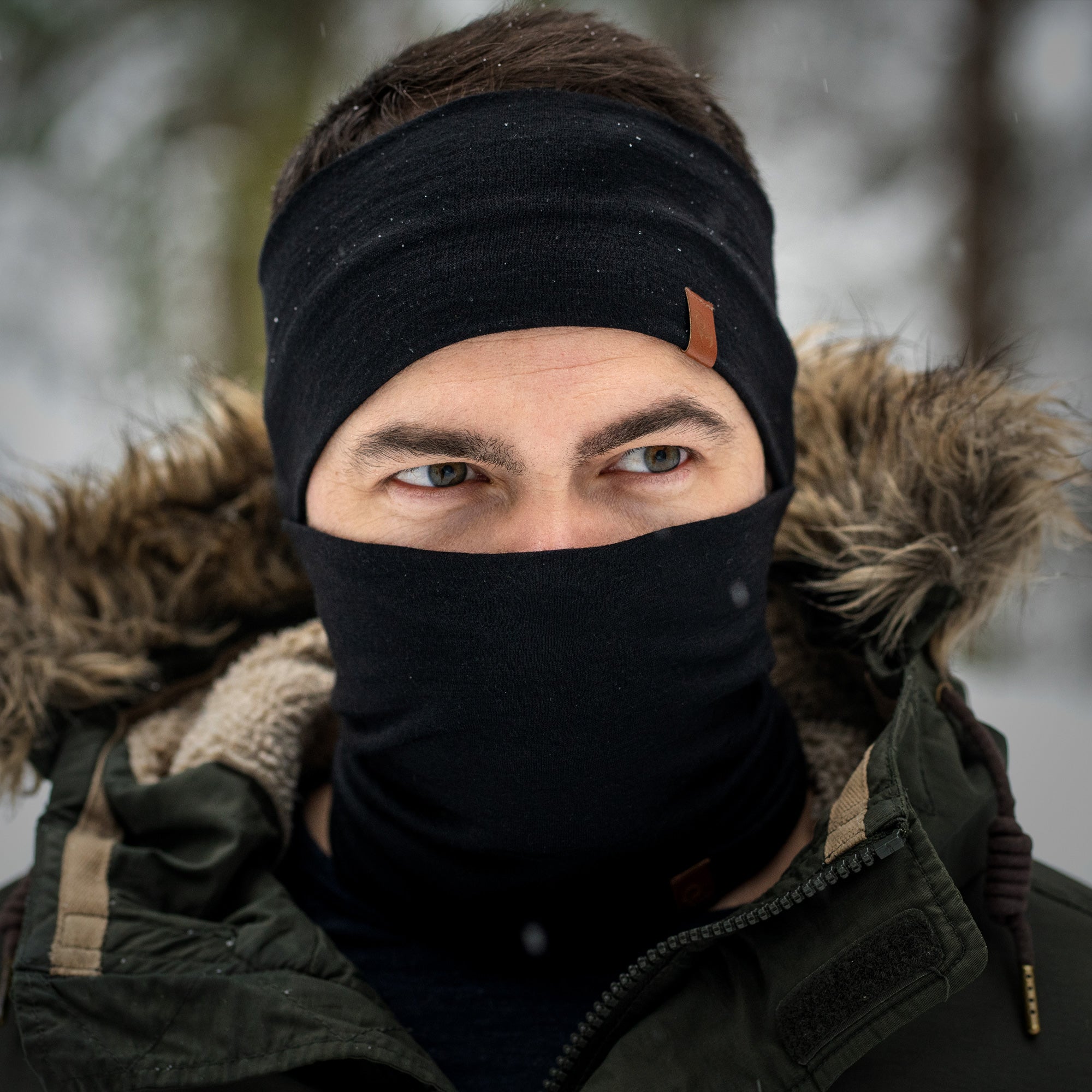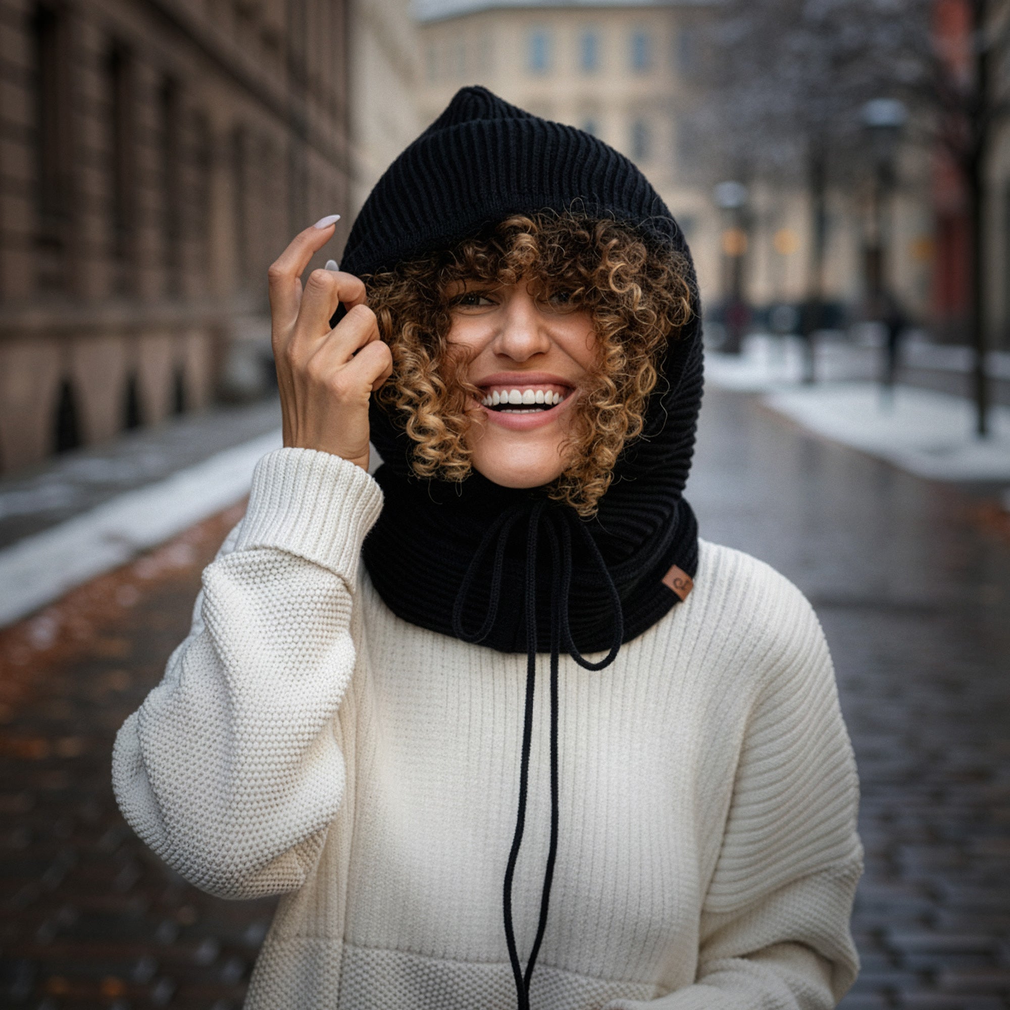Person wearing gray gloves with a festive outdoor setting featuring Christmas trees and lights.
