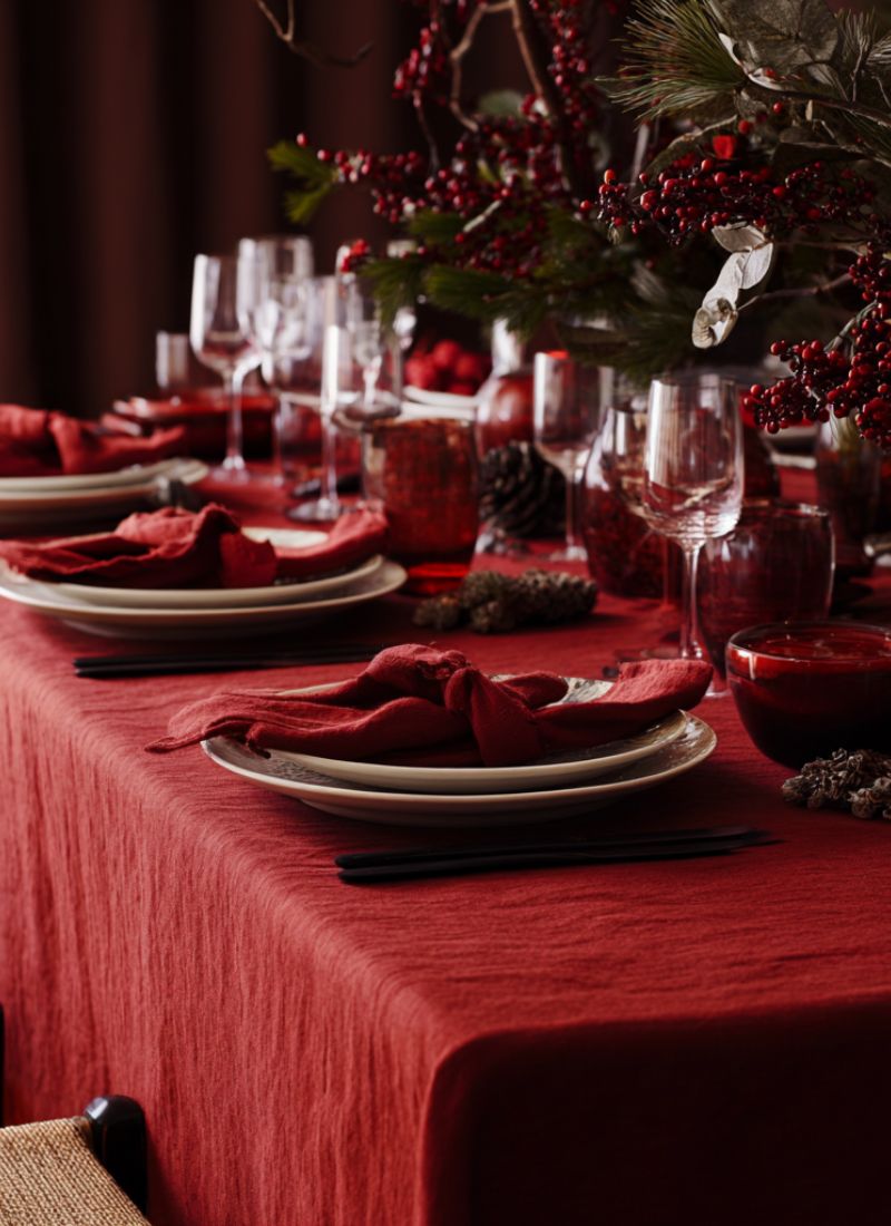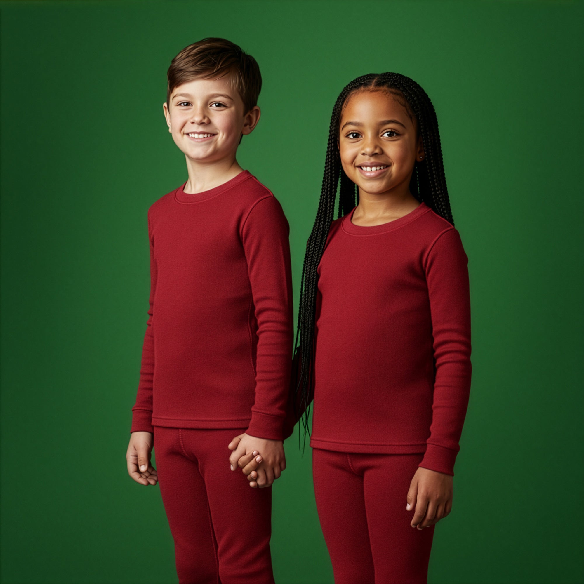 Red and green Christmas stockings hanging by a fireplace with a Christmas tree in the background.