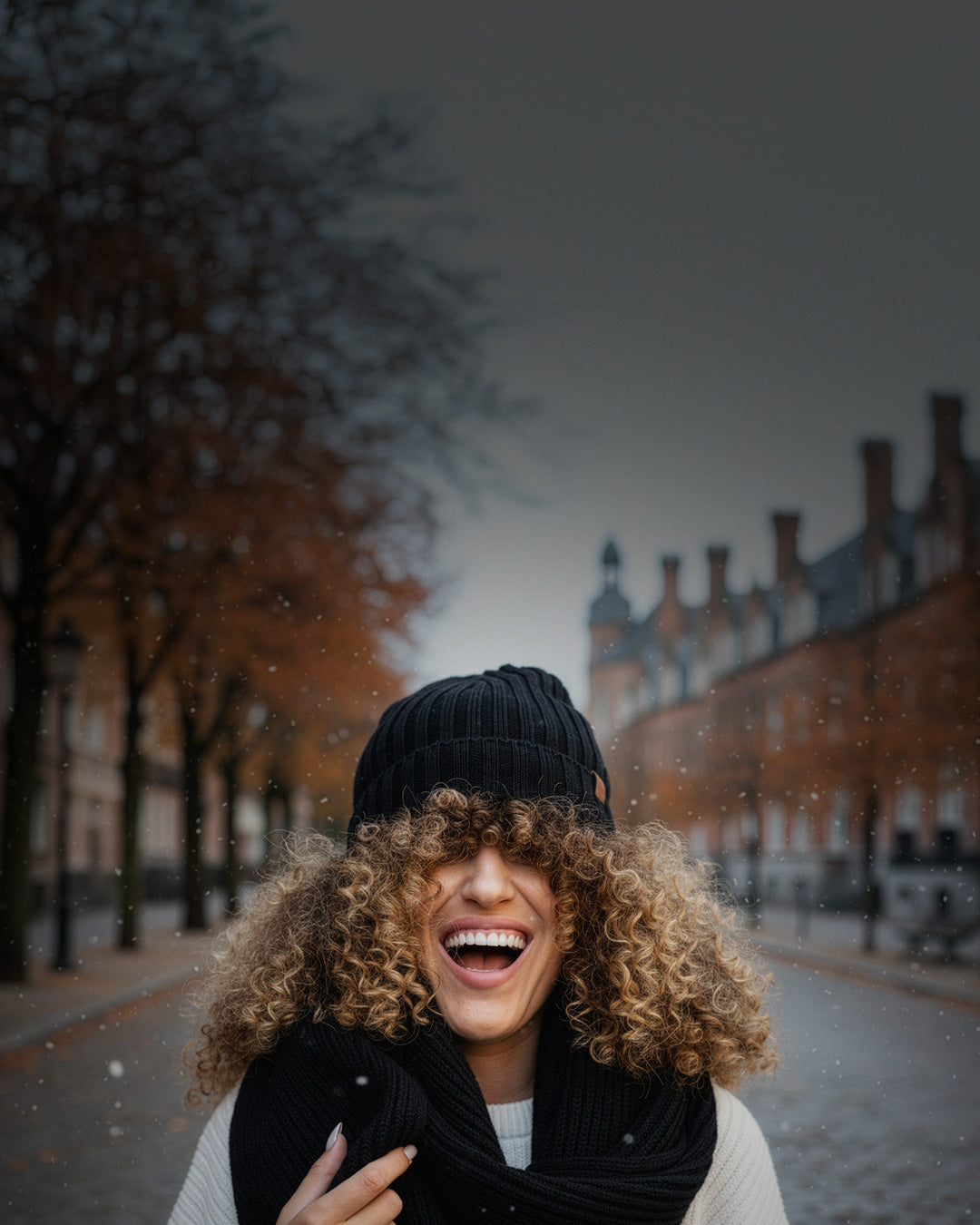 Man wearing a blue merino wool scarf on black merino long sleeve shirt standing in a forest