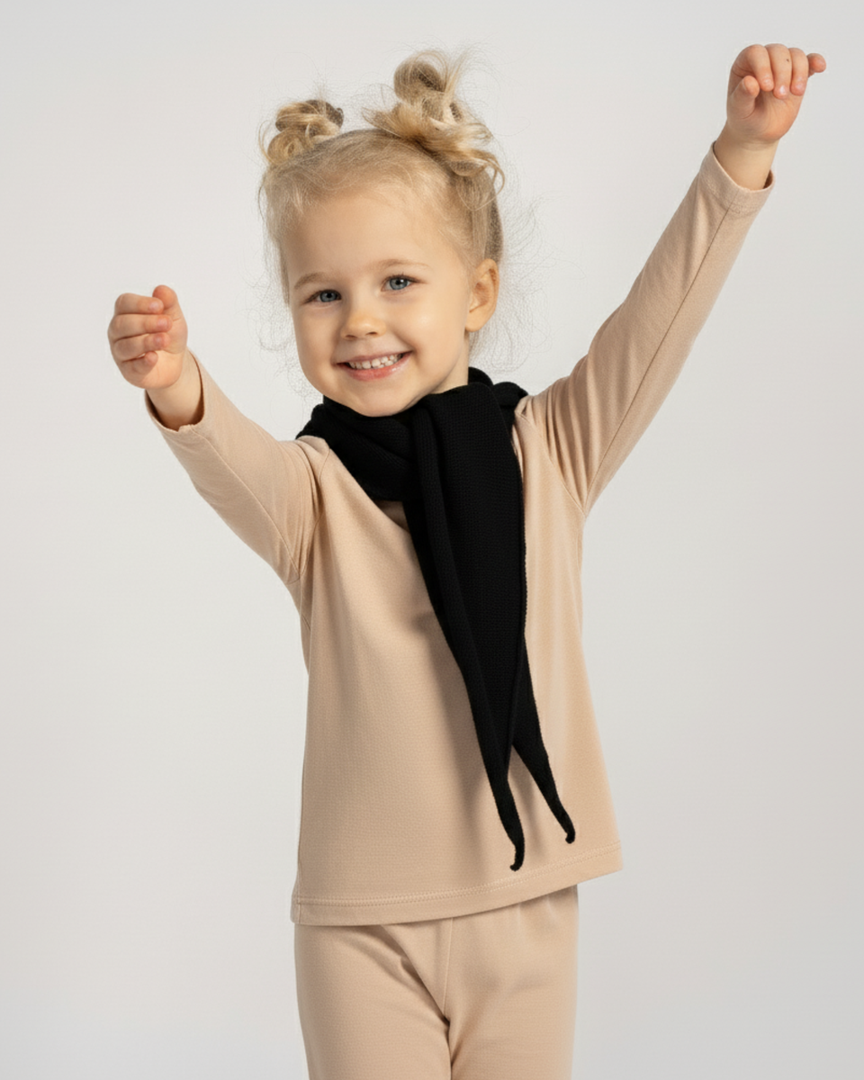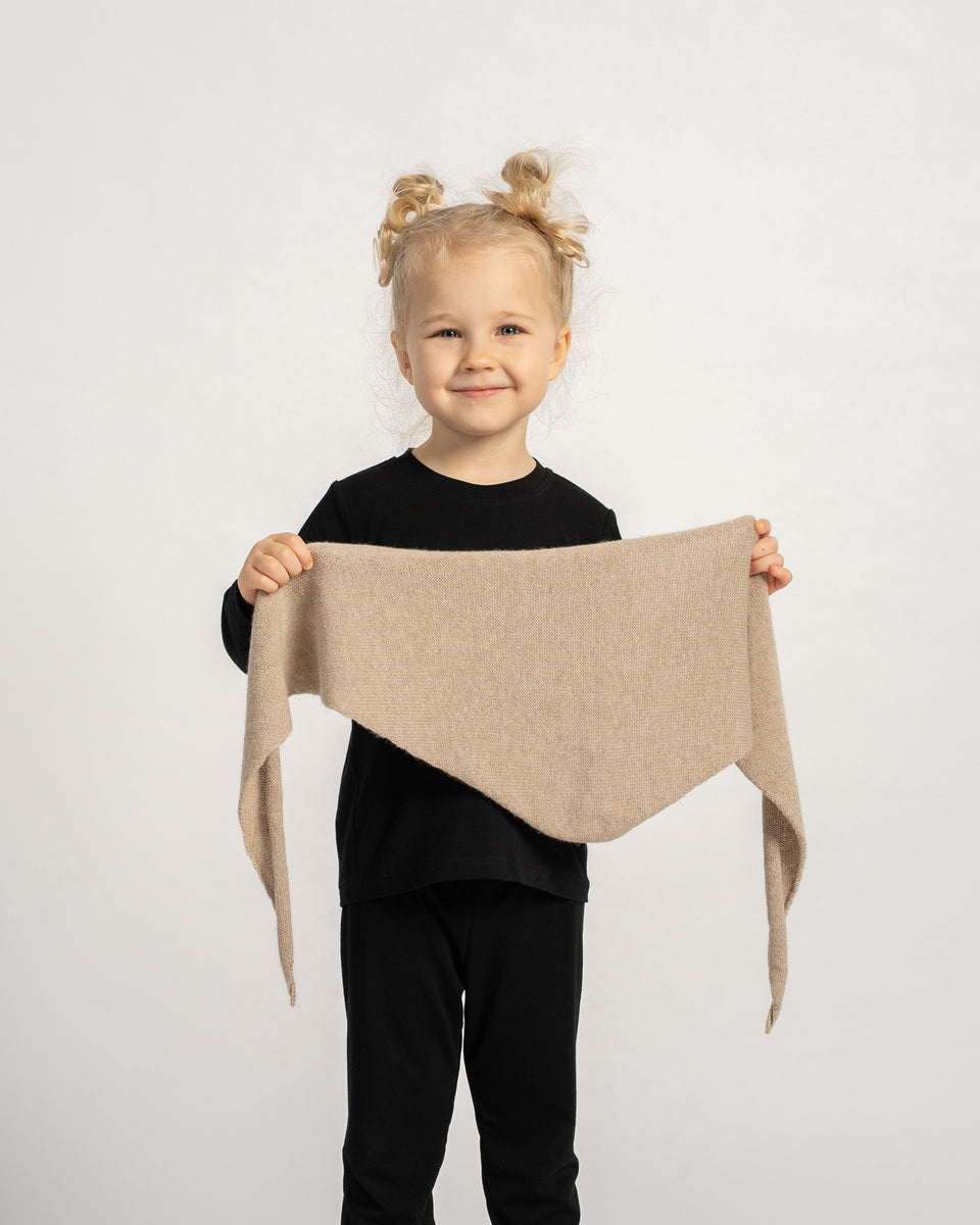 Made from a soft blend of 30% Cashmere and 70% Merino wool, this kids’ Cashmere knit bandana offers the perfect mix of luxury and performance. Merino fibers naturally regulate temperature and wick away moisture thanks to their fine, breathable structure, keeping skin dry even during active play. Smaller than a traditional scarf, this elegant triangle cut kerchief adds a refined touch to any outfit without feeling bulky or heavy. The practical tie closure keeps the knit triangle scarf securely in place and won’t mess up hair, making kids' bandana perfect for playtime, school, or outdoor adventures. Worn as a headscarf, neck accessory, or triangular bandana, this Cashmere knit is a stylish detail that blends everyday charm with the smart functionality of natural wool.