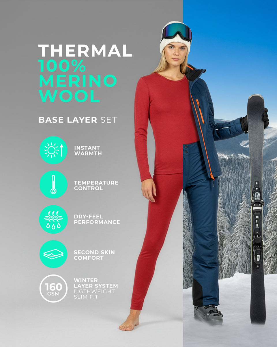 Light as a feather and comfortable at the same time  women’s long-sleeve top and leggings set is built for smart layering. Made from soft, breathable 160gsm 100% Merino wool, thermal set works as a next-to-skin layer that helps regulate temperature: warming you up in the cold and staying fresh when conditions shift. Designed to sit smoothly under mid and outer layers, the long-sleeve top features flatlock seams to reduce bulk and friction, while the elastic leggings move easily and stay in place for all-day wear. Both pieces are non-itchy and naturally odor-resistant, making the base layer set ideal for active outdoor use, travel, and everyday comfort at home. From winter layering to cool summer evenings, this versatile Merino wool set fits seamlessly into any wardrobe, any season.