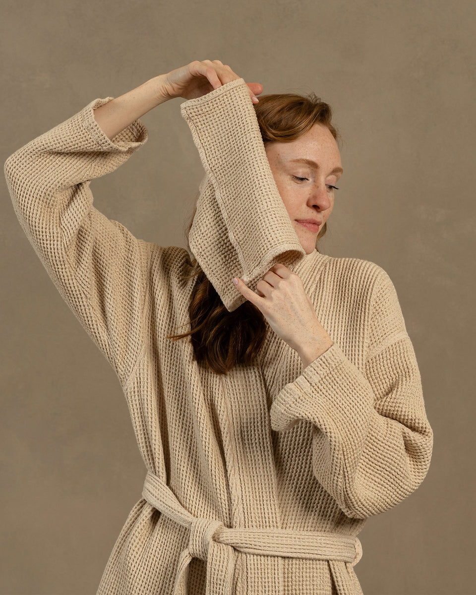 Crafted from a blend of 55% cotton and 45% linen, this waffle fabric is renowned for its highly absorbent nature. The waffle weave creates more surface area, allowing the fabric to trap and hold more moisture. Perfect for towels, robes, and other textiles, it efficiently absorbs moisture, ensuring you stay dry and comfortable while also enabling quick drying after use. Machine wash at 40°C with similar colors on a gentle cycle. Avoid using bleach. When ironing, use a medium-temperature setting. Do not dry clean. Tumble dry on low heat. Following these care instructions will help maintain the quality and longevity of your product.