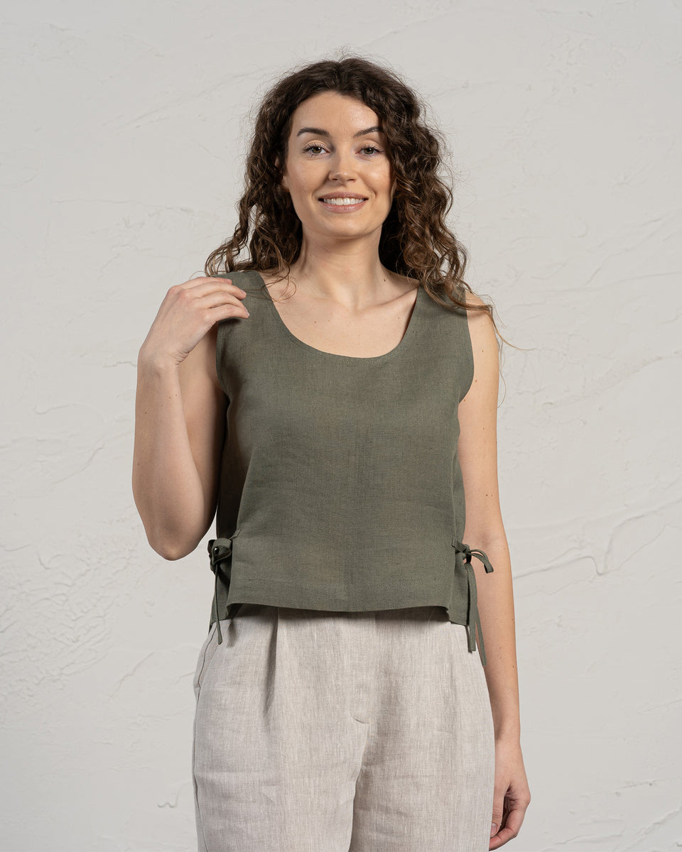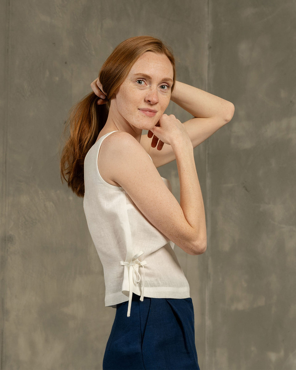 Get ready for a summer brimming with excitement with our Linen bow side tie top Audrey. Made from 100% high-quality linen, our crop top blouse showcases delicate side straps that tie into graceful ribbons, bringing an elegant touch to your summer look. Effortlessly pair this sustainable, sleeveless top with pleated pants, trousers, or shorts, and you are ready for adventures.