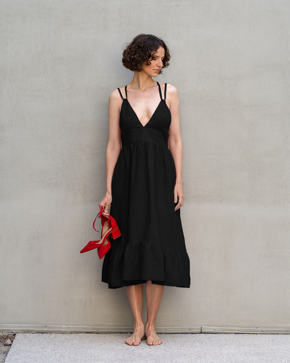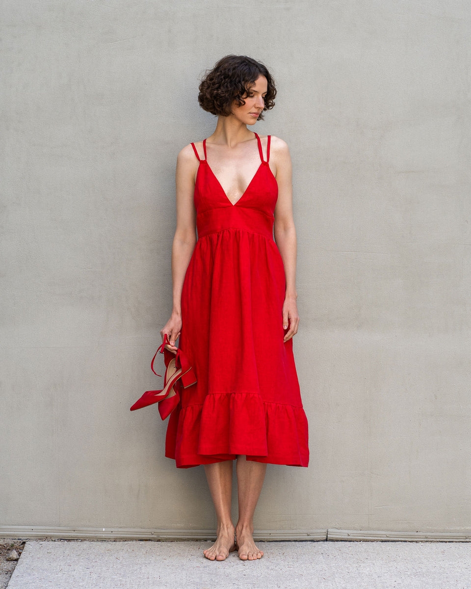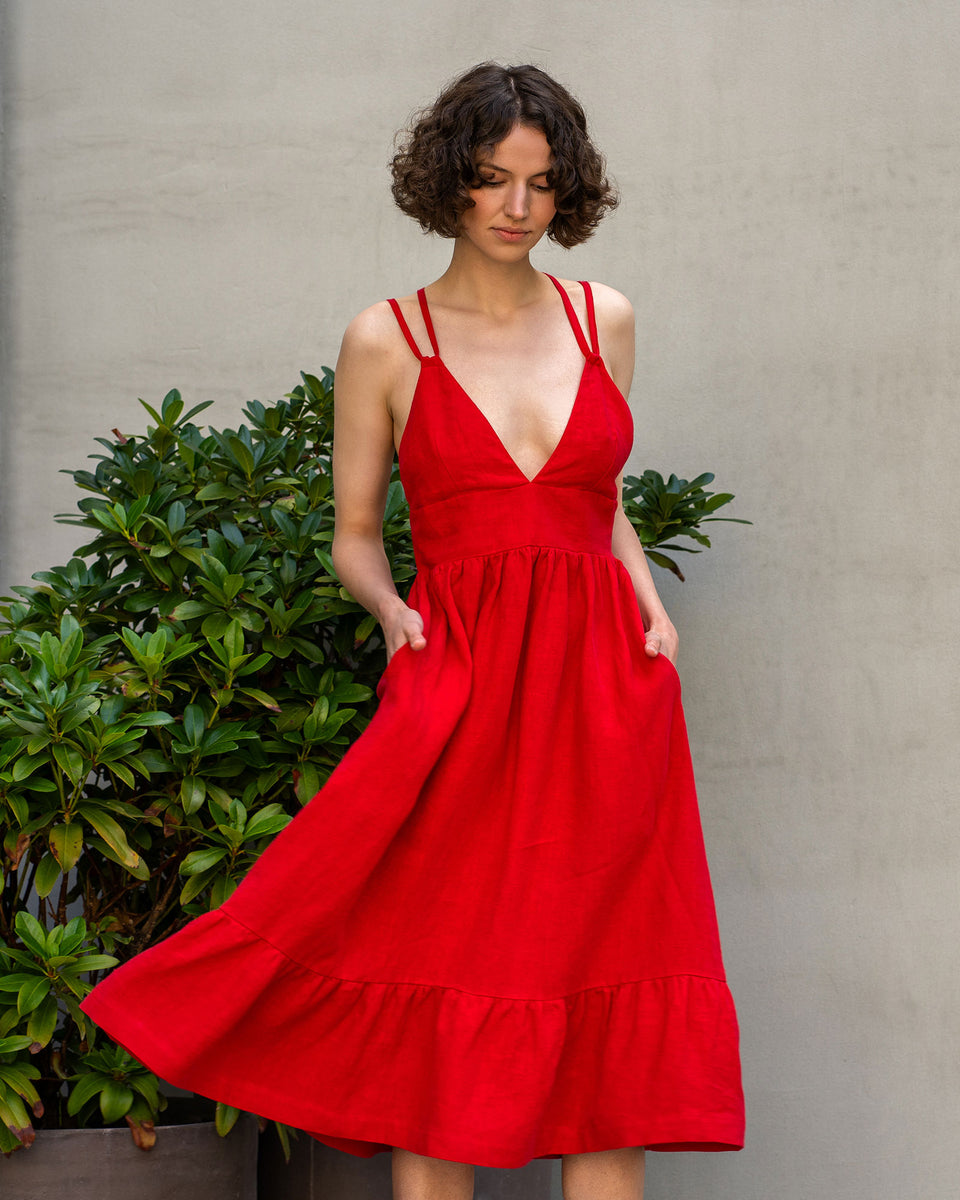 Crafted from exquisite linen fabric, this dress drapes gracefully, accentuating your every move with an air of elegance. The elegant backless design, adorned with lace-up details, adds a touch of sensuality to your ensemble. With its flowing smock silhouette, this dress embodies timeless romance.