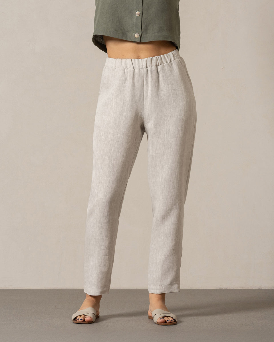 Elevate your wardrobe with our Dakota pants, where sustainable luxury meets unmatched comfort. Made from soft 100% Linen, these high-waisted pants offer exceptional quality and a refined feel. Linen pants higher waist and an elastic waistband provide a perfectly comfortable fit that flatters every figure. The tapered leg design makes Linen trousers incredibly adaptable, transitioning seamlessly from dressy occasions with heels to relaxed outings with trainers. Simply adjust the cuff length to match your desired look and step out in style.