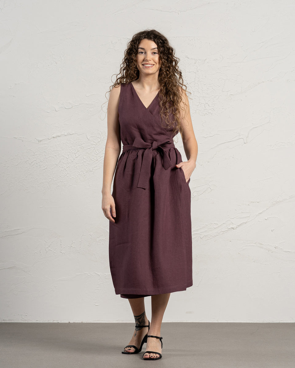 Linen sleeveless smock summer dress features a practical wrap design, creating a figure-flattering look. Our Linen dress has two side pockets and an elegant V-neckline, ensuring your experience is not only comfortable but also practical and glamorous.