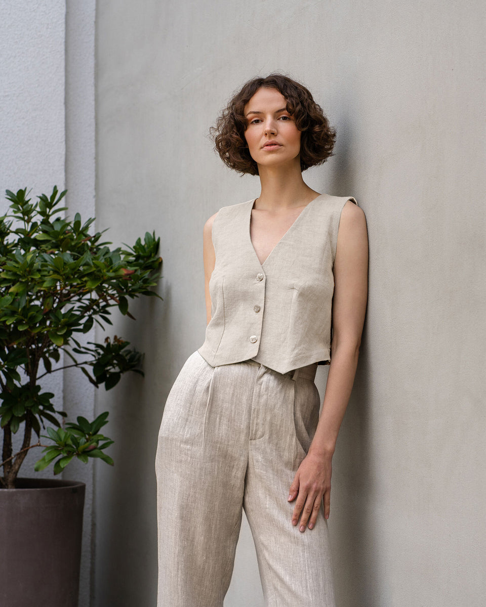 Classic yet trendy Linen outfit—featuring the beloved 'Ava' vest and 'Lotus' pleated wide-leg pants. Crafted from 100% organic Linen, our semi-formal outfit for women is not only timeless but also versatile. Mix and match it with various tops, bottoms, and outerwear for a lifetime of stylish looks.