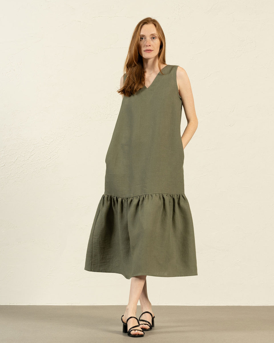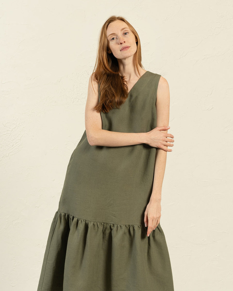 Featuring ruffles at the bottom and eye-catching smock details, our Linen dress is feminine and fun without the fuss. Gentle V-neckline, playful ruffles at the bottom, hidden pockets, and timeless color make for the perfect long-lasting statement linen dress deserved to be worn at the most special of occasions.